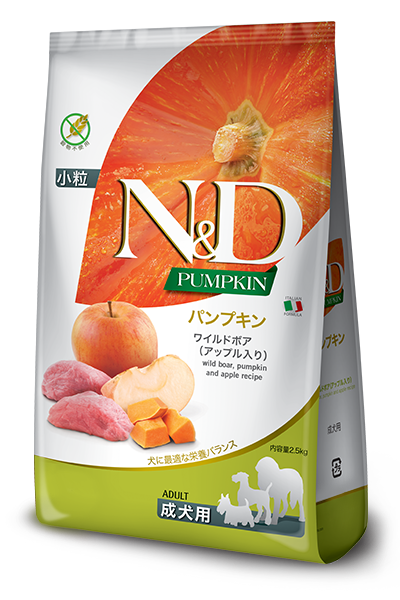 イノシシ肉、乾燥イノシシ、エンドウ豆デンプン、鶏脂、乾燥パンプキン、アップル、乾燥全卵、ニシン油、エンドウ豆繊維、乾燥ニンジン、天日乾燥アルファルファミール、イヌリン、フラクトオリゴ糖、酵母抽出物、乾燥ホウレンソウ、オオバコ、乾燥ザクロ、乾燥オレンジ、乾燥ブルーベリー、乾燥ビール酵母、ウコン、グルコサミン塩酸塩、コンドロイチン硫酸、アロエベラゲル濃縮物、緑茶抽出物、ローズマリー抽出物、